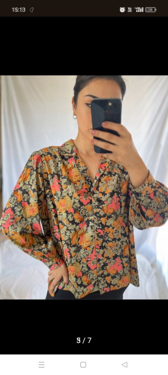 Kadınlar için bol kesim, uzun kollu, V yakalı, düğmeli, çok renkli çiçek desenli, ipeksi dokulu günlük sokak giyimi gömlek.