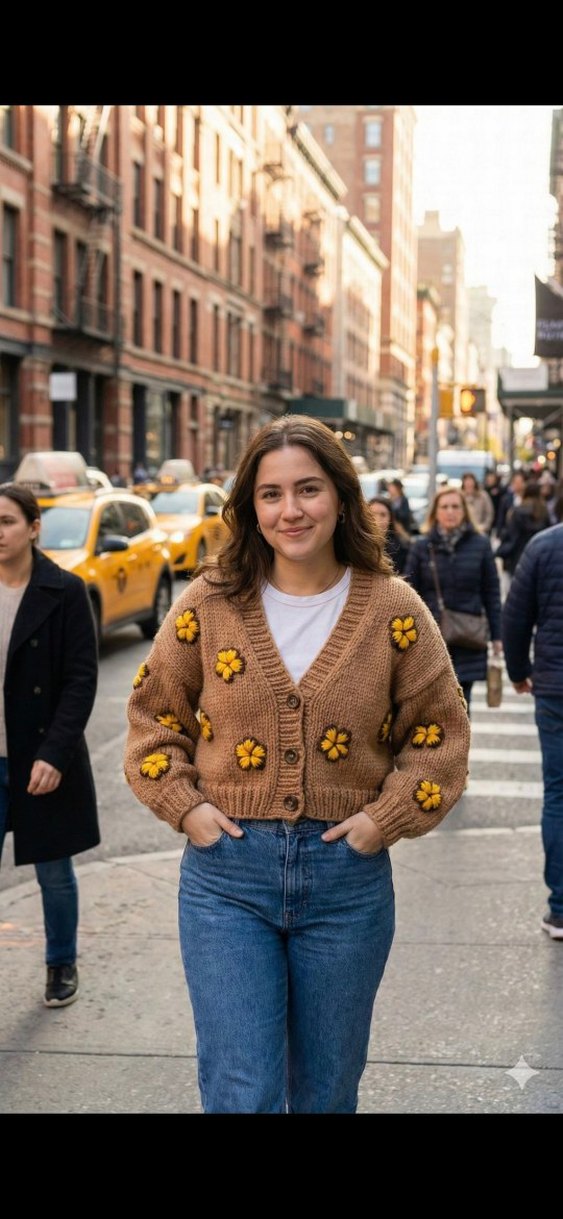 Sarı çiçek desenleriyle süslenmiş, uzun kollu, kahverengi triko ve bol kesim hırka. Günlük rahat kullanıma uygundur.