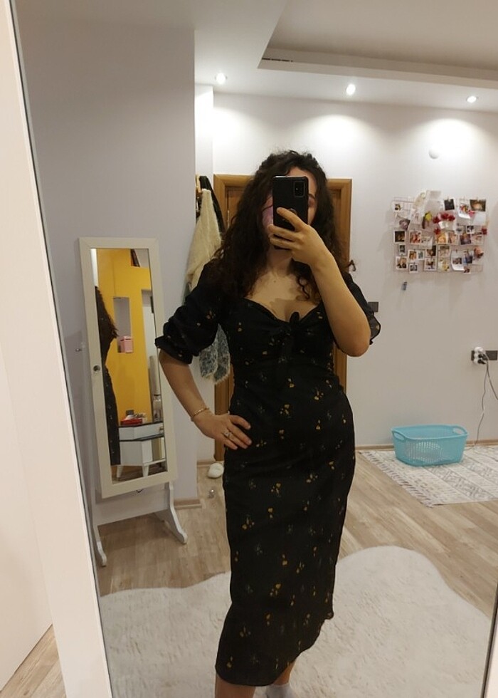 Cicek desenli kalp yaka elbise