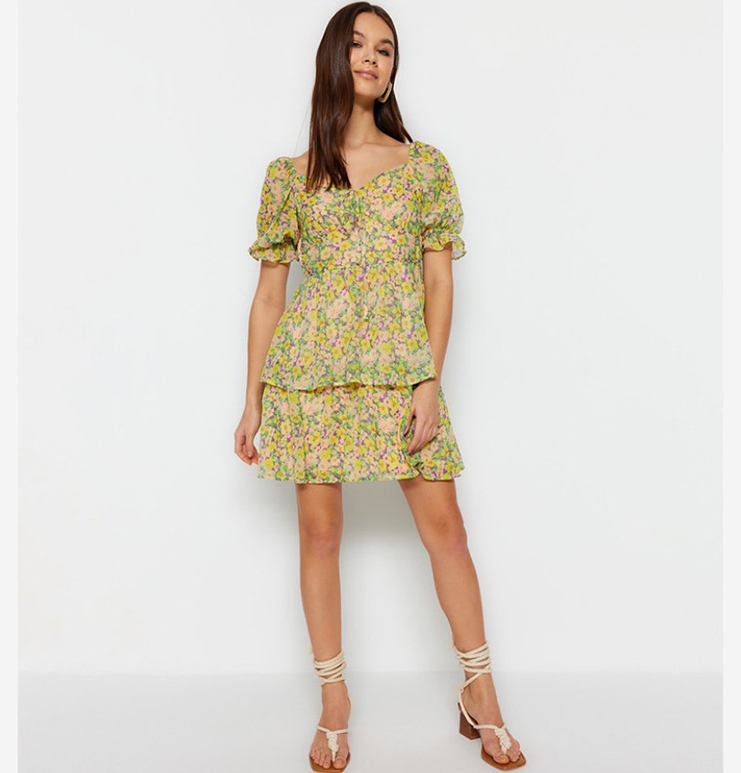 Çok şık çiçek desenli kalp yaka mini elbise Kat kat tasarımıyla yazın hem rahat hem zarif duruyor. Hiç giyilmedi, sadece etiketi yok
