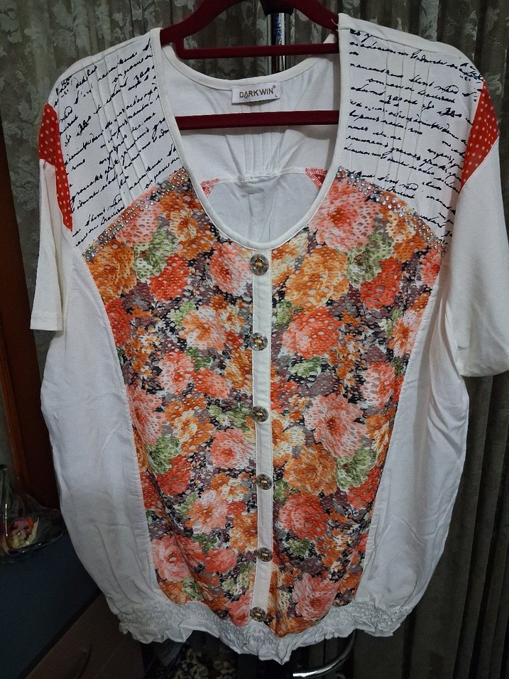 Kısa kollu, düğmeli, penye, çiçek baskılı, rahat kesim kadın bluz, günlük kullanım için uygun rahat bir model. Darkwın. L B.