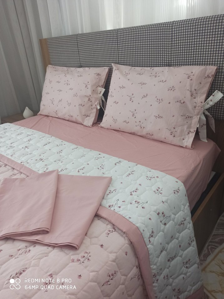 çift kişilik kapitone pike takımı 1 adet kapiton pike 2 adet çiçekli yastık 2 adet düz yastık Bir tane lastikli çarşaf