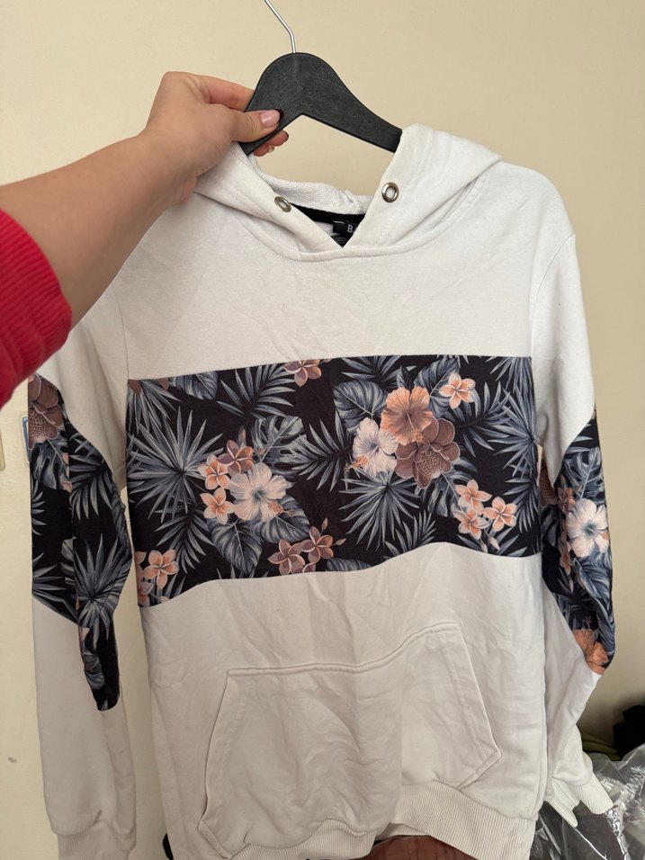 Uzun kollu, bol kesim, yuvarlak yaka kadın sweatshirtü. Beyaz zemin üzerinde gri çiçek desenli, kapüşonunda düğmeli, sentetik kumaştan yapılmıştır.