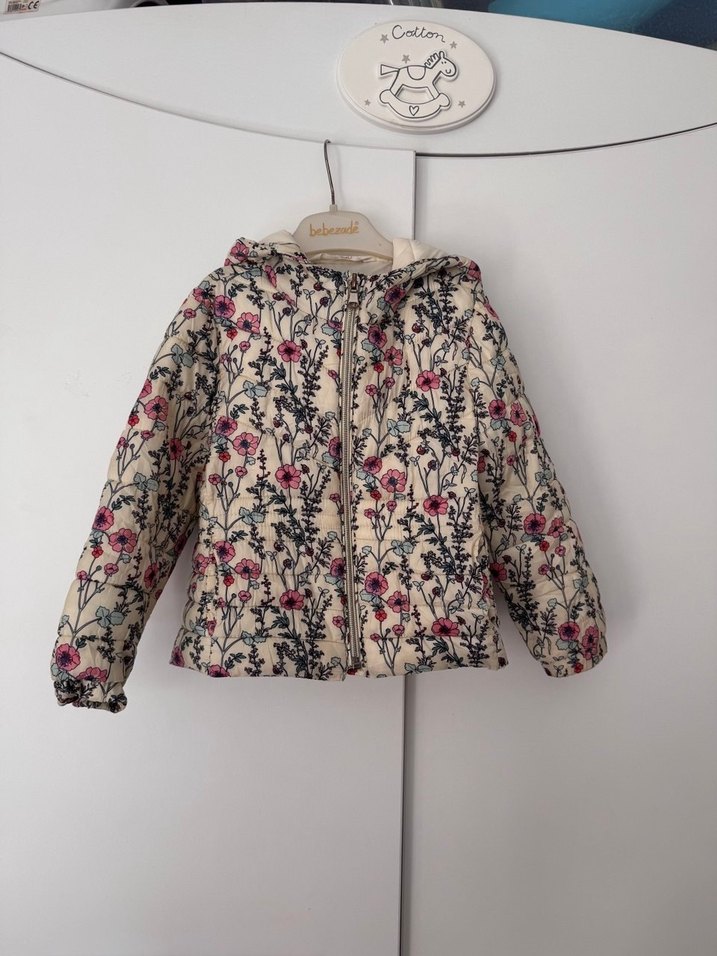Bohem tarzı için kapüşonlu, düğmeli, çiçek desenli açık bej renkli bol kesim kız montu .