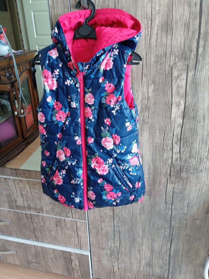 Renkli çiçek desenli, pembe kapüşon astarlı, fermuarlı, dar kesim kız yeleği. Sokak stiline uygun, kolsuz ve iki cep bulunur. çift taraflı kullanılır