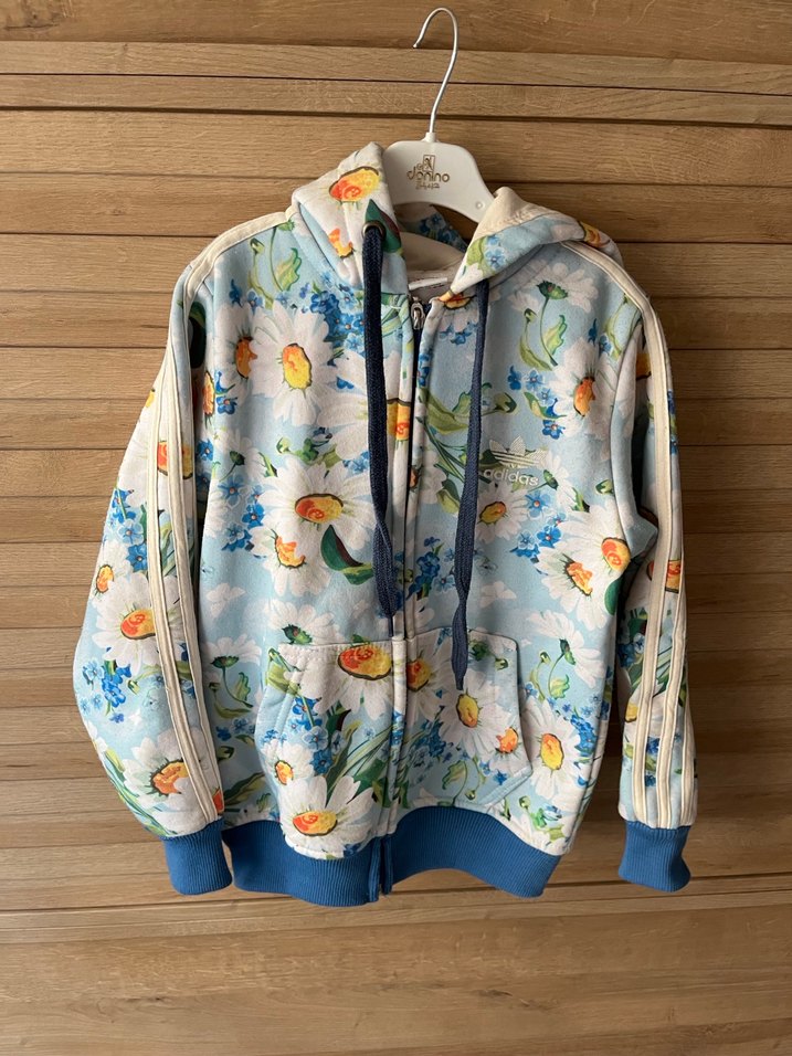 Kız çocuğu için bol kesim, uzun kollu, kapüşonlu ve fermuarlı ön kısma sahip, yumuşak ve sıcak kumaştan yapılmış pastel çiçek desenli mavi ceket.