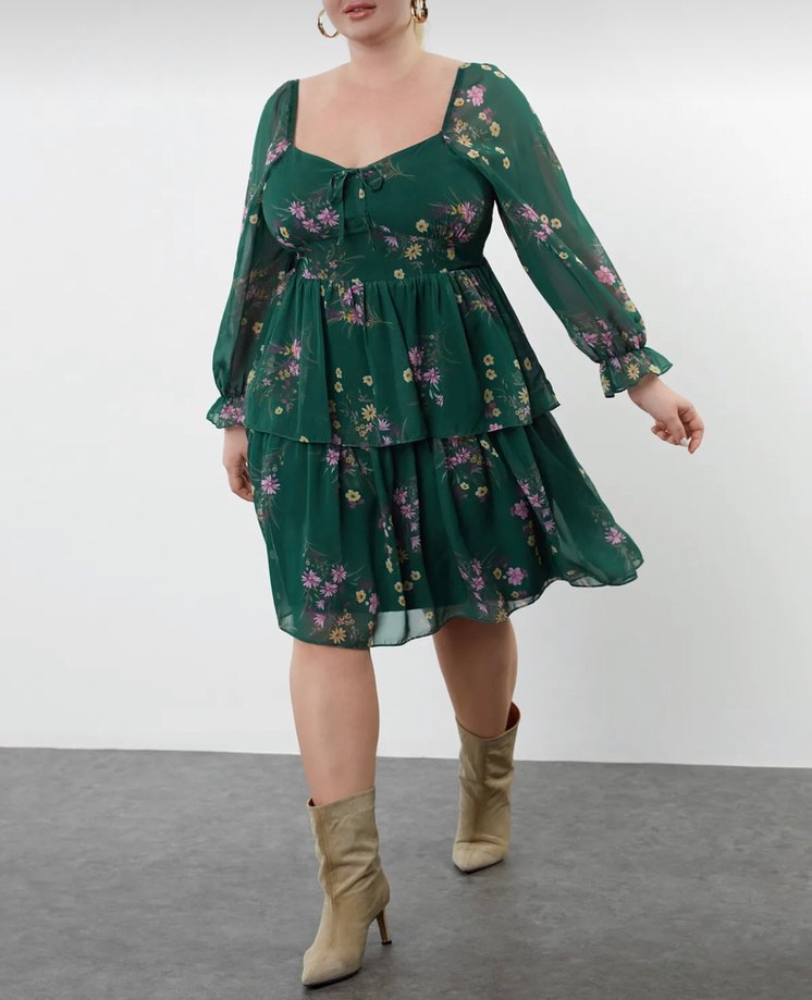 Çiçek Desenli Kat Kat Büyük Beden Bohem Elbise