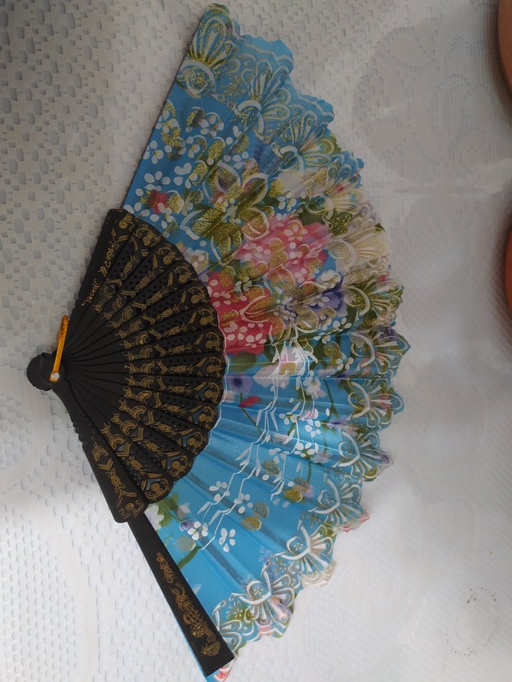 Katlanabilir el yelpazesi, mavi zemin üzerinde canlı çiçek desenlerine sahip ve koyu renkli dekoratif çubuklarla tasarlanmıştır. Hafif ve taşınması kolaydır.