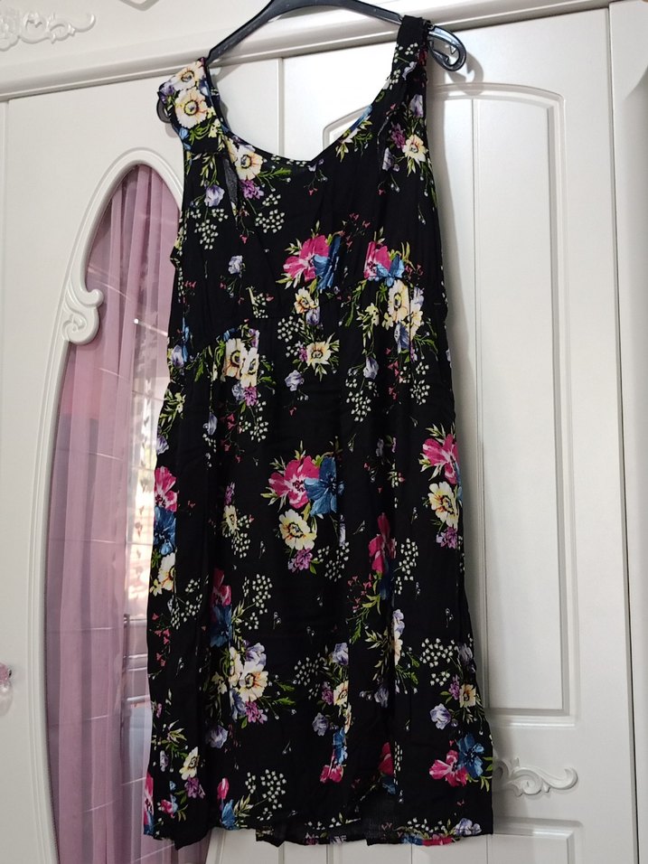 Kayık yaka, kolsuz, bol kesim midi elbise. Yumuşak sentetik kumaştan, koyu renkli çoklu çiçek desenli, romantik gece için uygun bohem gotik tarzda.