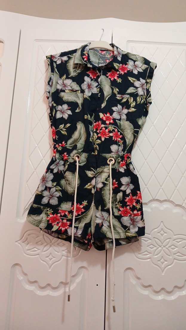 Kolsuz, halter yakalı, çiçek desenli koyu renk sentetik kumaştan, kemerli ve vücuda oturan kısa tulum. Bohem tarzını yansıtır. xs s uyumlu