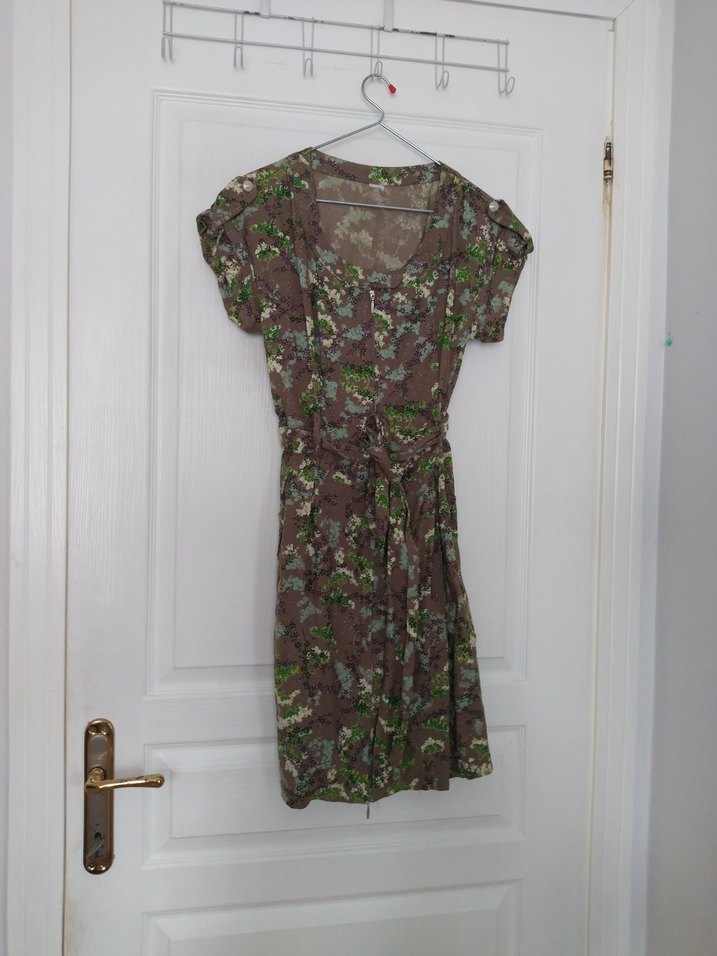 Kadınlar için çiçek desenli, kemerli midi elbise. Kısa kollu, bisiklet yakalı. Biraz kalın bir kumaşa sahip tam bahar serinliğinde giyilmeye uygun, önü fermuar ile açılıp kapanıyor. Kahverengi tonlarında günlük kullanıma uygundur.