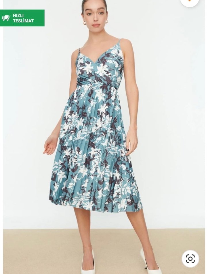 Navy renkli, çiçek desenli, pilili ve bol kesim elbise. İnce askılı ve V yaka, yumuşak sentetik kumaştan, rahat sokak tarzı için uygun.