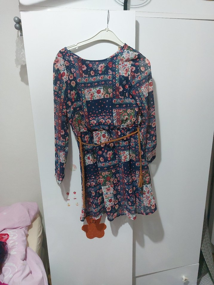 Çok renkli koyu çiçek desenli, kemerli, uzun kollu, yuvarlak yaka, bol kesim kız elbisesi.