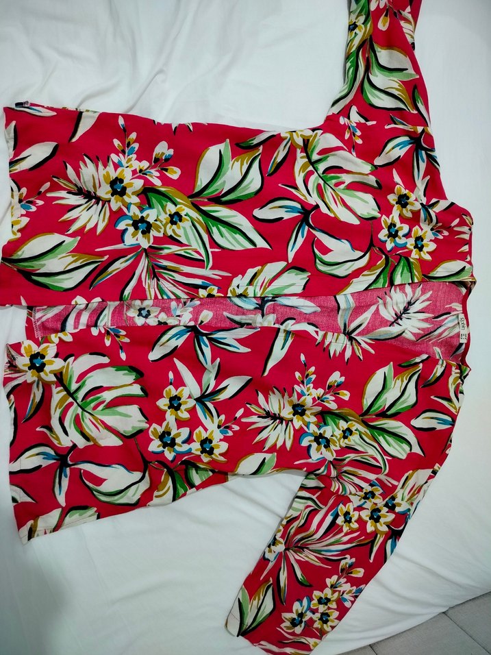 Fuşya pembe çiçek desenli Kimonolu Keten takım 36 beden olup 38 beden kalıbındadır. 1 kez giyildi.