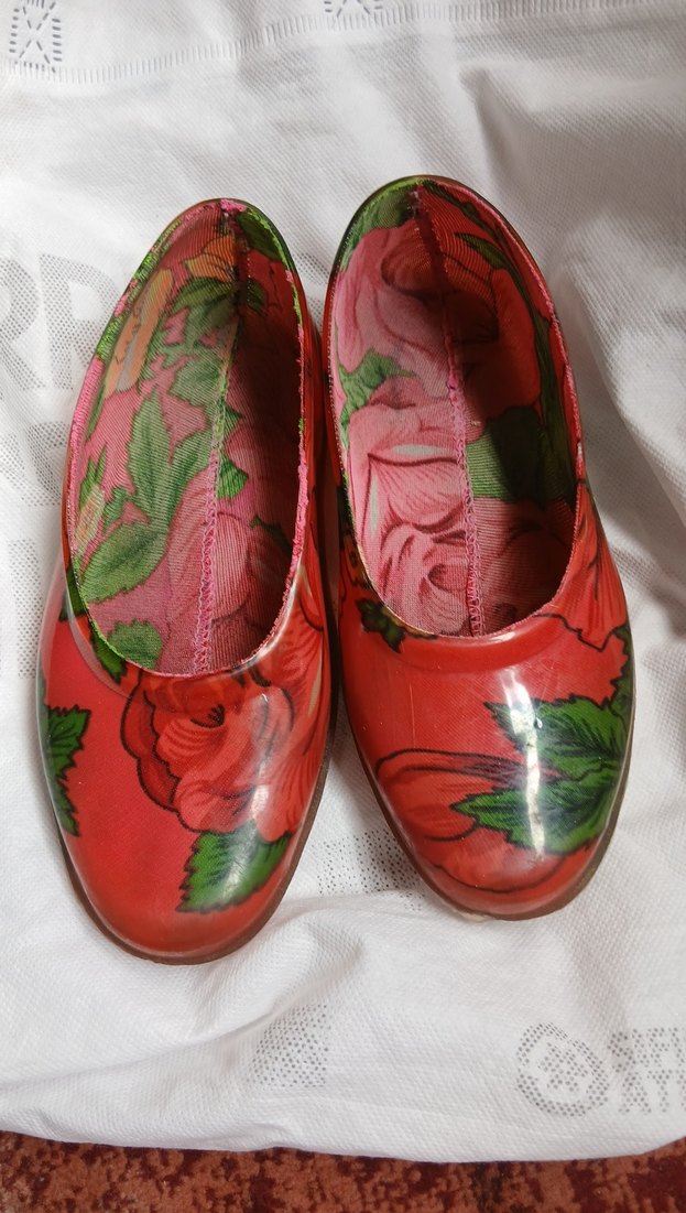 Kırmızı taban üzerinde canlı çiçek desenli, topuklu kadın terlikler. Kauçuk malzemeden, düğmeli detaylı, bohem ve vintage tarzına uygun.