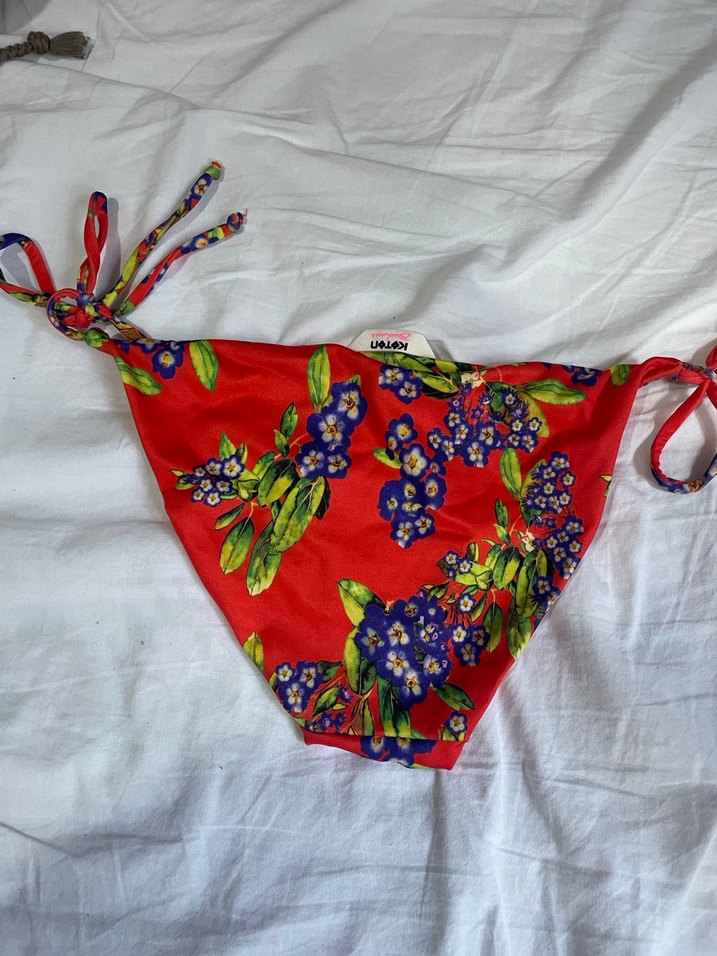 Bu bikini altı, kırmızı zemin üzerinde renkli çiçek desenleri ve ayarlanabilir bağlamalı şerit detaylara sahiptir. Bohem tarzda plaj için uygundur.