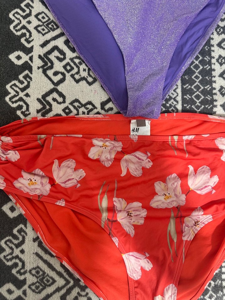 Çiçek desenli ve kırmızı renkli, vücuda oturan bikini altı, Kuramızı 54 beden büzgülü Simli mor Brazilian xxl beden bikini altı İkisi de hiç giyilmedi İkisi de H&M marka