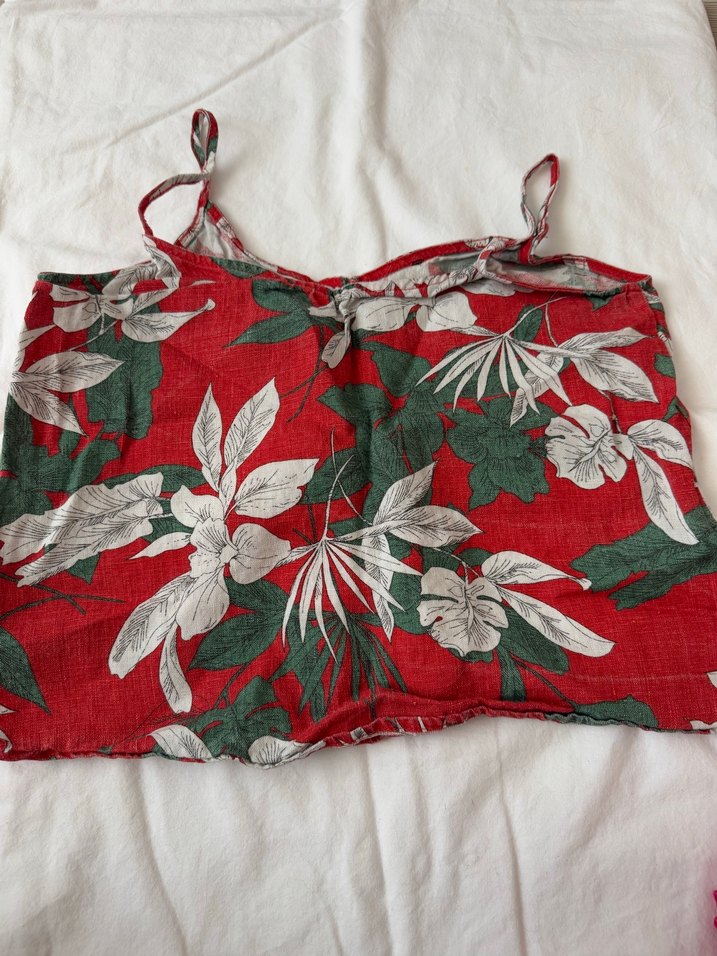 İnce askılı, düğmeli ve çiçek desenli kırmızı bohem mini bluz, rahat ve salaş bir kesime sahiptir.