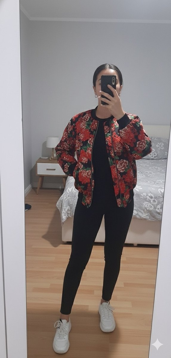Çiçek Desenli Kırmızı Kadın bomber Ceket 1.68 boy 58 kilo