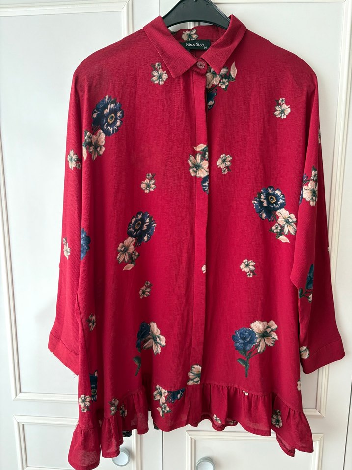 Uzun kollu, çiçek desenli kırmızı gömlek. Yaka kısmı yakalı ve etek ucu fırfırlı, bohem tarzda günlük kullanıma uygun.