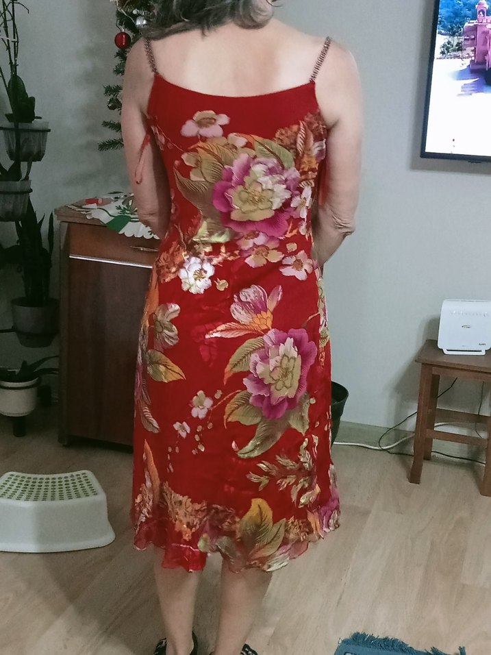 Kırmızı sentetik kumaştan, çiçek desenli, drapeli ve straplez yaka detaylı, vücuda oturan midi boy bohem elbise. Romantik akşamlar için ideal.