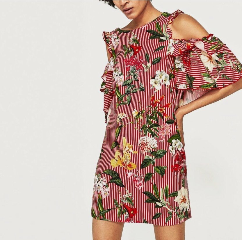 Renkli çiçek desenli kırmızı midi elbise, fırfırlı ve kısa kolludur. Straplez yakalı, rahat kesim bohem tarzda romantik akşamlar için uygundur.