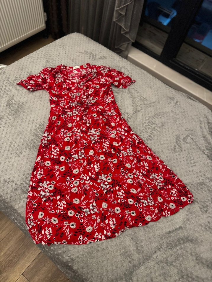 Renkli kırmızı çiçek desenli, kısa kollu, V yaka, düğmeli ve bol kesim uzun bohem elbise. Rahat ve günlük kullanım için uygundur.