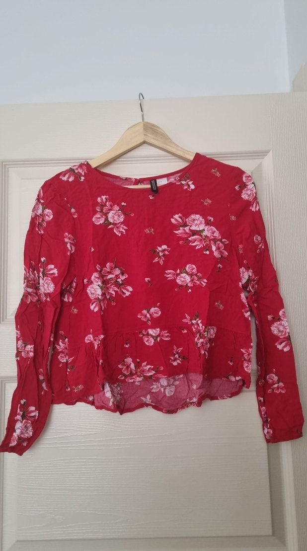 Kırmızı, uzun kollu, düğmeli ve çiçek desenli bol kesim bluz. Hafif sentetik kumaştan, bohem tarzda.