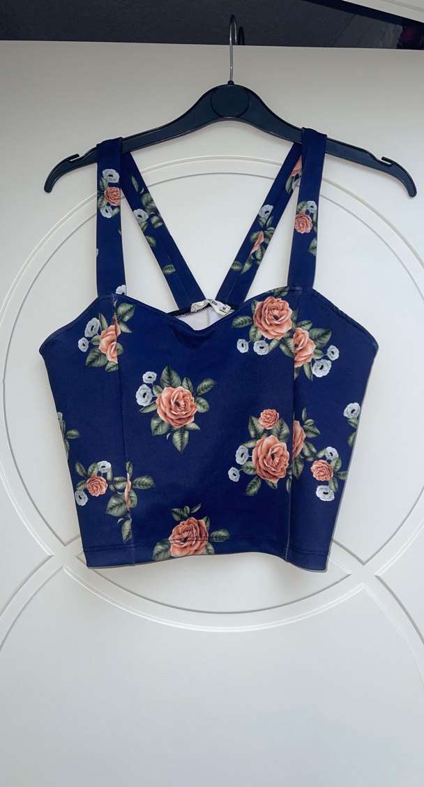 Koyu mavi, çiçek desenli, askılı ve düğmeli, kısa ve vücuda oturan crop top. Günlük ve sokak stili için uygundur.