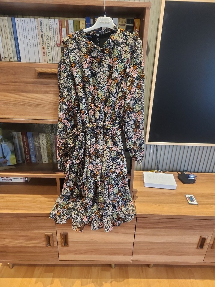 Kısa, rahat kesim bohem elbise, uzun kollu ve yüksek yakalıdır. Çok renkli çiçek desenine sahiptir ve beli kuşaklıdır. Eteği katlıdır. Yumuşak sentetik kumaştan üretilmiştir. Marka temsilidir