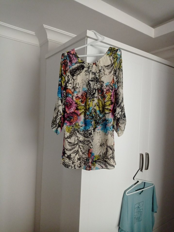 Çiçek desenli, bol kesim ve kısa boyda, askısız, yarım kol çok renkli, sentetik kumaştan bohem tarzda günlük kullanıma uygun elbise iki kol arası 44 cm boy 84 cm mbeden uyumludur