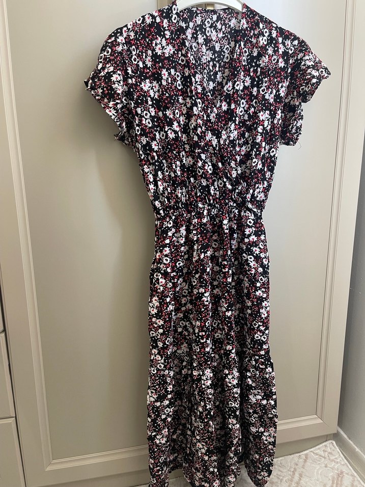 Kısa, bol kesim elbise, koyu renkli çok renkli çiçek deseni, V yaka ve fırfırlı kısa kollu, bohem tarz için uygun.