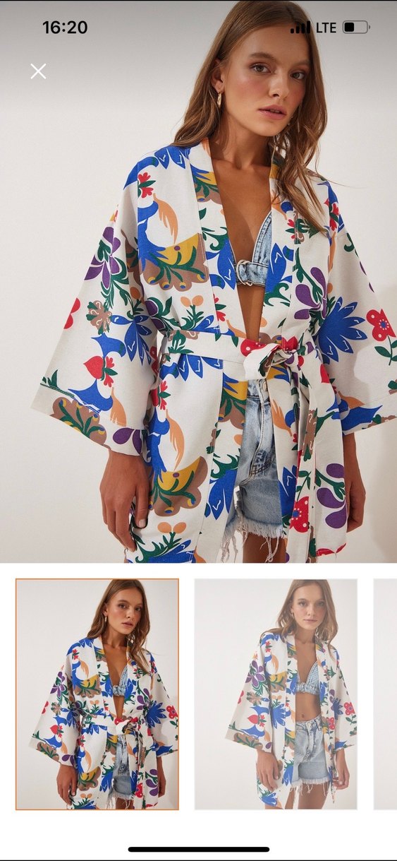 Çiçek desenli, V yaka ve drapeli kısa kollu, bol kesim bohem kimono, günlük kullanıma uygundur.