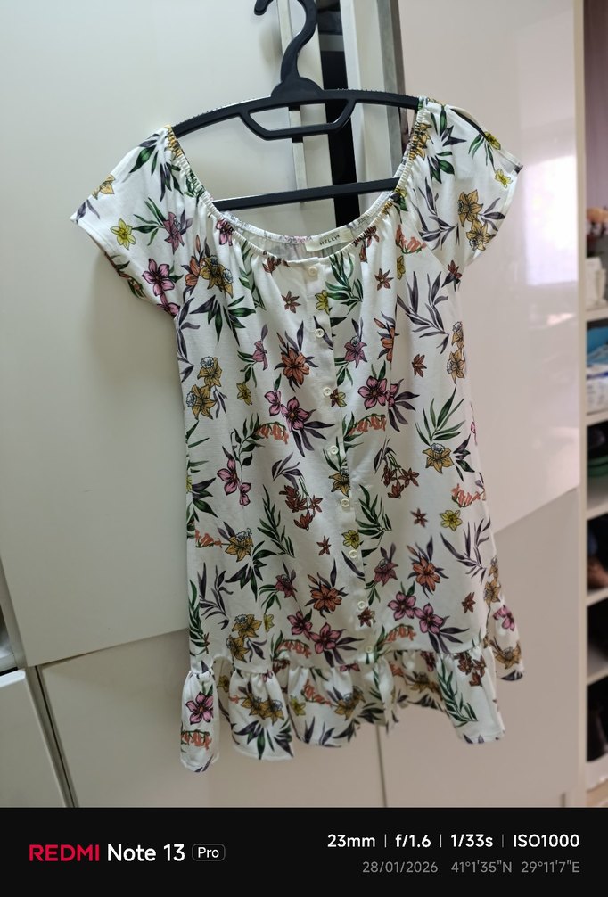 Bol kesim, kısa kollu straplez kısa elbise hafif çiçek desenli ve fırfırlı detaylıdır. Yumuşak sentetik kumaştan yapılmış, bohem tarz için uygundur. marrka hm değildir butikten alinmistir