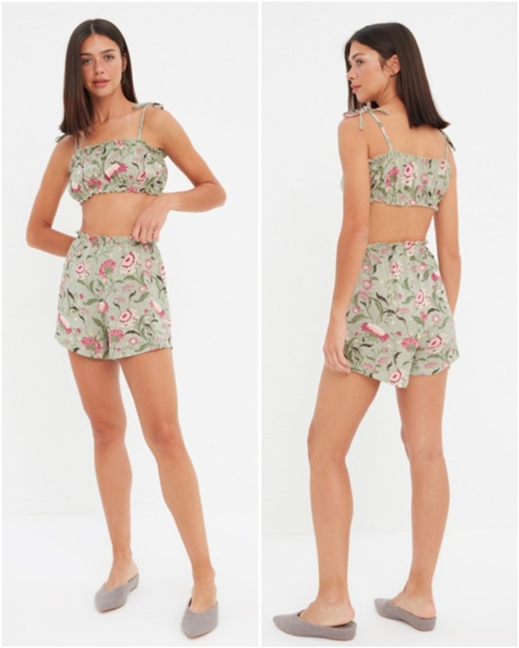 Kadınlar için çiçek desenli, askılı yaka ve bol kesimli kısa şort.