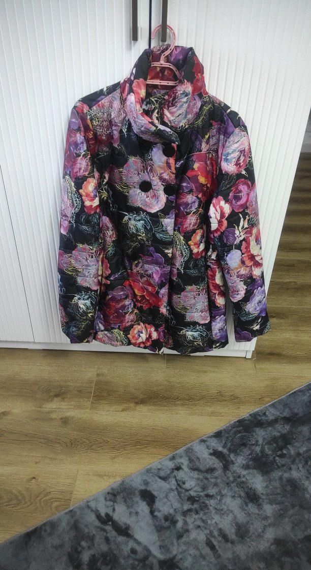 Çiçek desenli, kısa ve bol kesim kadın kabanı. Sentetik kumaştan, uzun kollu, kayık yaka ve düğmeli, günlük kullanıma uygun rahat bohem tarz.