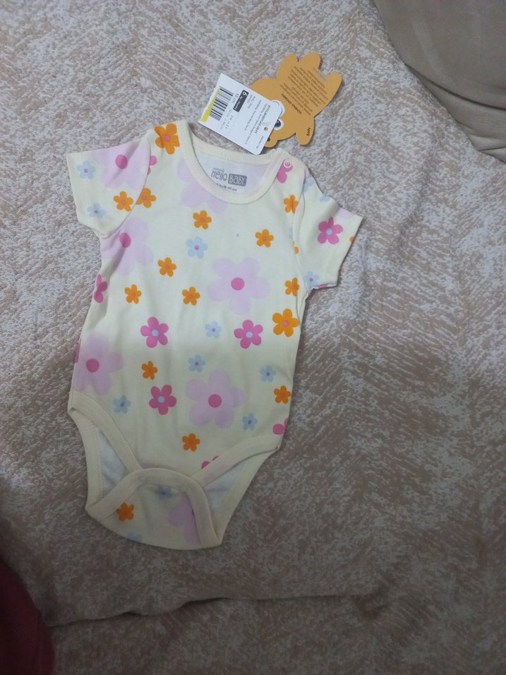Beyaz, kısa kollu, yuvarlak yakalı bebek body. Renkli çiçek desenleri ve düğmeli kapanışı vardır.