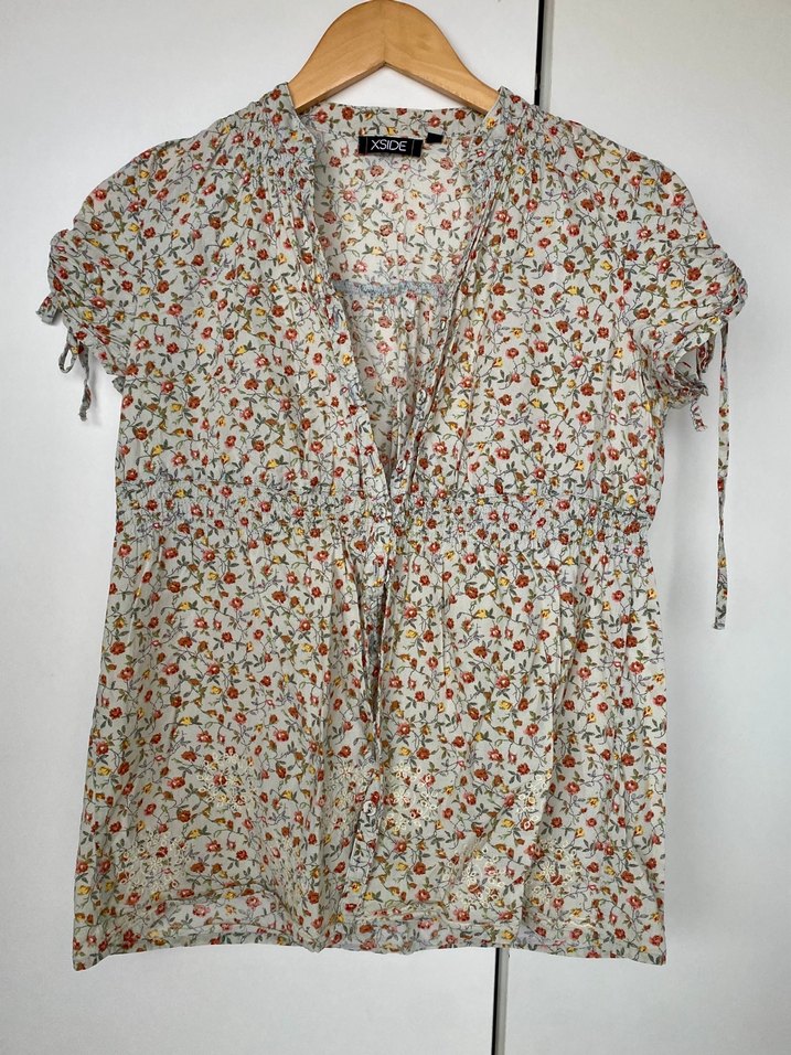 Pamuklu kumaştan, düğmeli, V yakalı, kısa kollu, çiçek desenli bluz