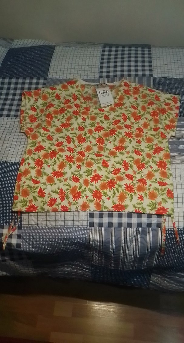 Renkli çiçek desenli , kısa kollu, tekne yaka, bol kesim kadın bluz. sıfır etiketi üzerinde S-M Beden