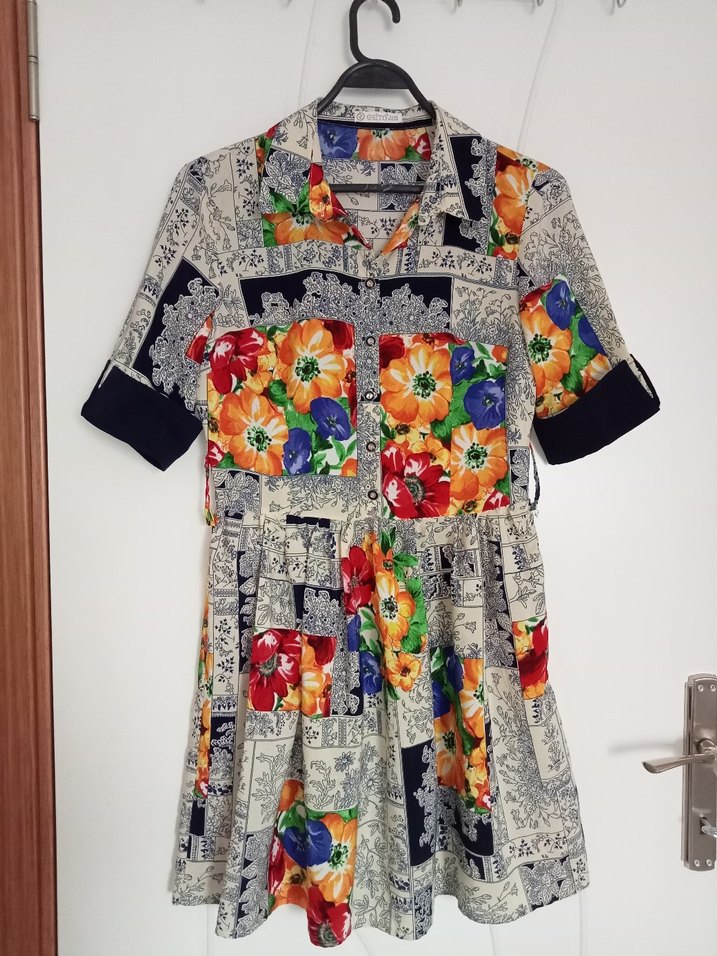 Renkli desenli, kısa kollu, yakalı ve düğmeli önü olan bohem mini elbise. Salaş kesim ve vintage tarzıyla günlük kullanıma uygun. Boy 86- Beden 38- Bel 36- İkikol arası 47- Kolboyu 30- Markası Esito..