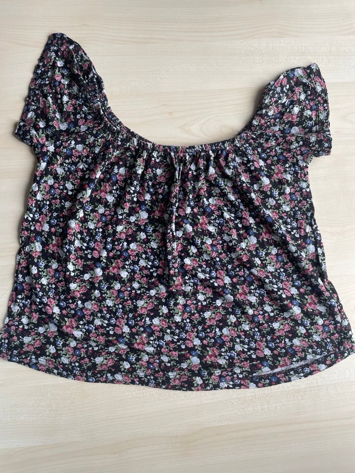 Kısa kollu, salaş kesim kadın bluz, kayık yaka ve renkli çiçek desenli, sorunsuz.