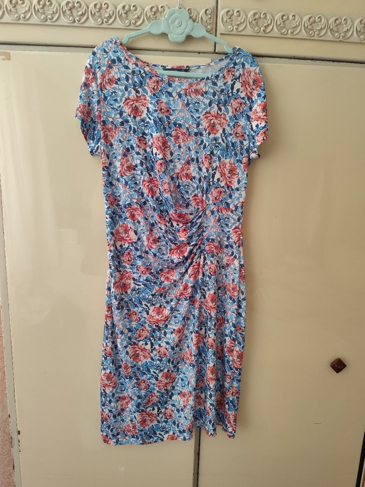 Renkli midi elbise, kısa kollu ve V yakalıdır. Drapeli tasarımı ve çiçekli batik deseniyle yumuşak sentetik kumaştan üretilmiştir.