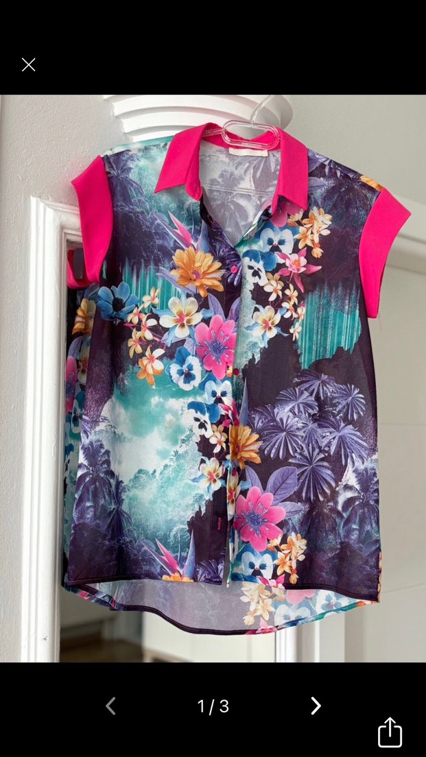 Renkli çiçek desenli, kısa kollu, düğmeli ve yakalı mor bluz, sentetik kumaştan ve bol kesimdir.