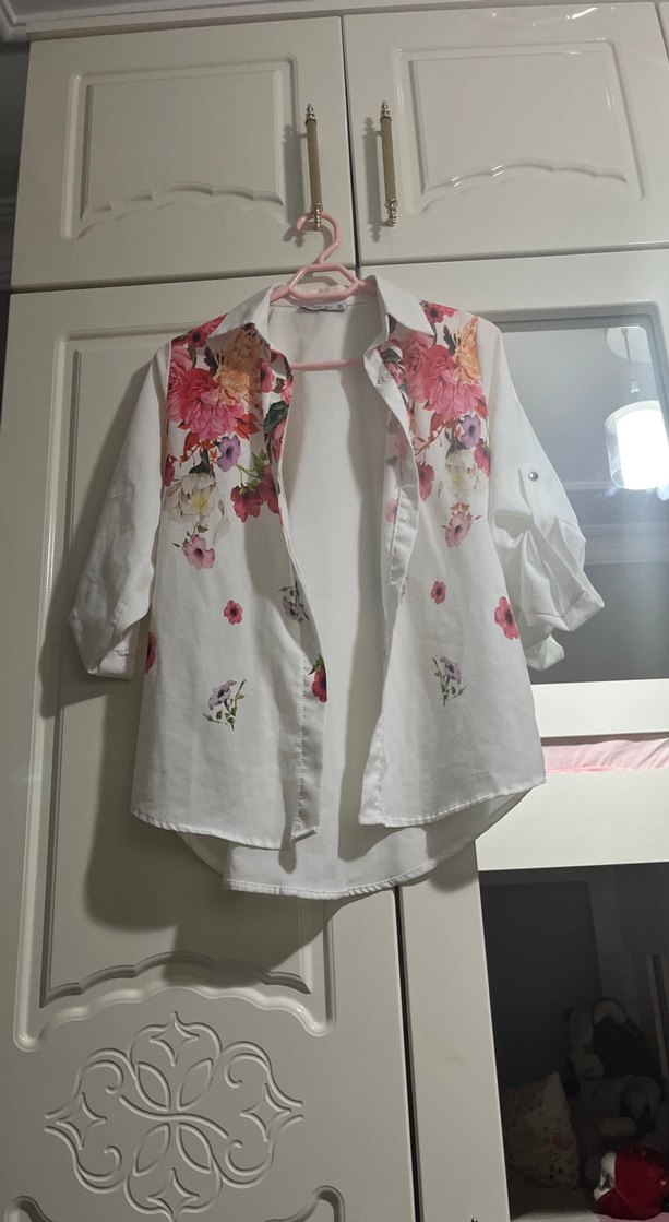Pamuklu beyaz gömlek, kısa kollu ve yakalıdır. Düğmeli ön kısmı ve çiçek desenleriyle rahat ve şık bir görünüm sunar.