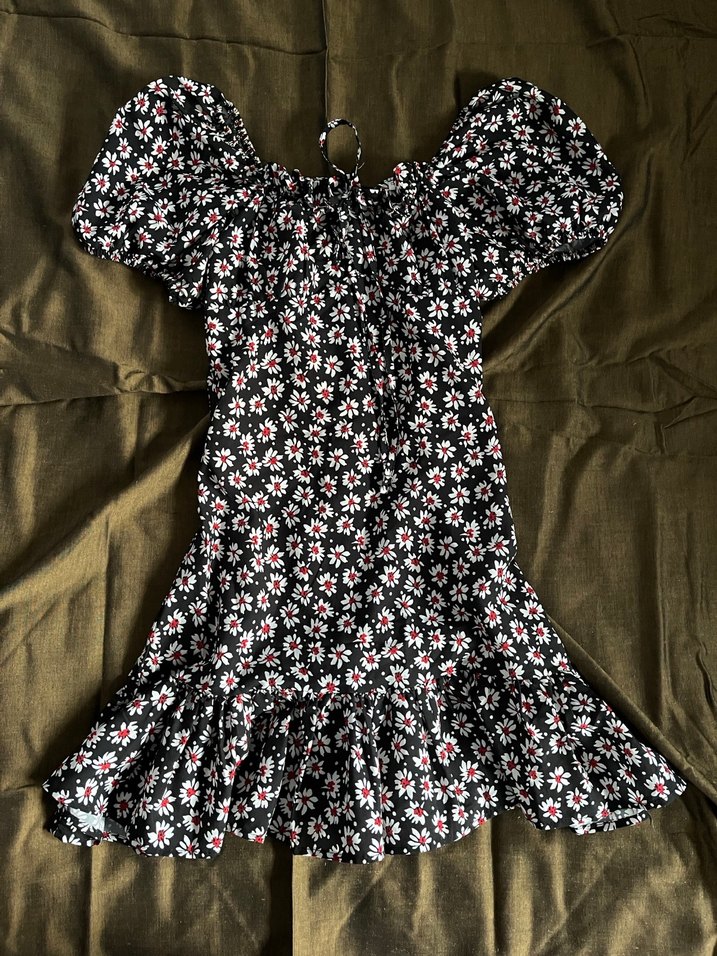 Sentetik kumaştan, çiçek desenli ve volanlı kısa elbise. Geniş kesim, kayık yaka ve askılı kollara sahiptir. Günlük kullanıma uygundur.