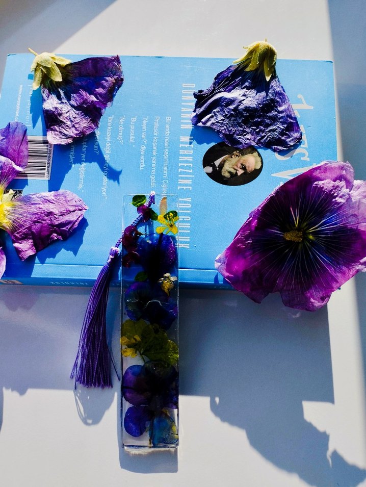 Mavi kapaklı sanat kitabı, renkli çiçeklerle süslenmiş kitap ayracı ve etrafında mor kuru yapraklar bulunuyor.