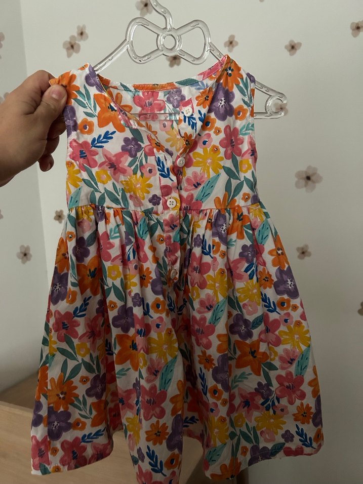 Düğmeli, askısız yaka ve bol kesim kız çocuk elbisesi. Pastel renklerde çiçek desenli, yumuşak dokulu kumaştan üretilmiştir. Çok az giyildi