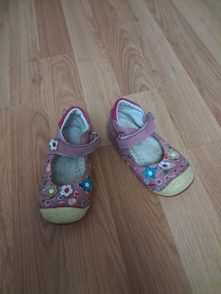 Pembe pastel renkli, lastik tabanlı, çiçek desenli ve tokalı, bohem tarzda kız bebek ilk adım ayakkabısı.