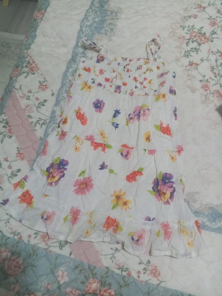 Askılı, salaş kesim ve fırfır detaylı kız çocuk elbisesi. Sentetik kumaştan, pastel çok renkli çiçek desenli bohem tarzda.