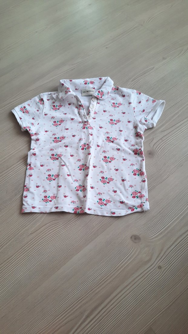 Beyaz renkli, pamuk kumaştan yapılmış kız çocuk gömleği. Kısa kollu, yakalı ve düğmeli ön kısmıyla rahat bir kesime sahip. Pastel çiçek desenleri bulunur.